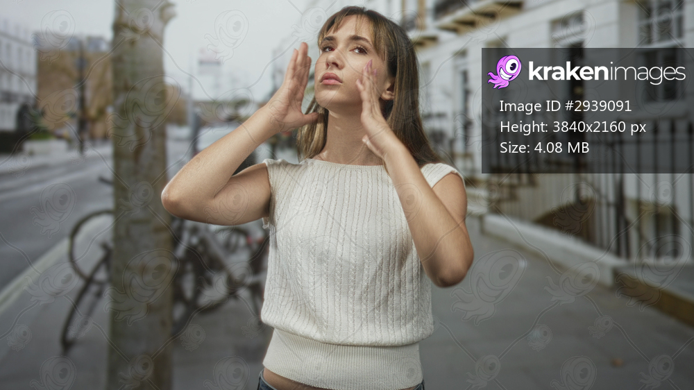 Woman touching hair with hands on city street wearing white sweater and jeans, gaze upward and fingers near face; serenity introspection.