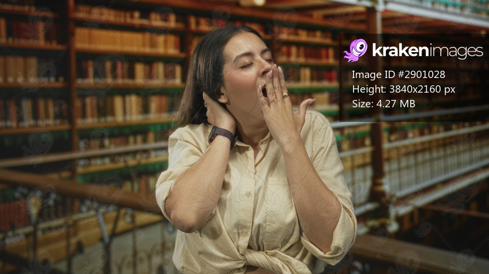 Woman touching hair with left hand, eyes closed and slight smile, wristwatch on wrist, knotted shirt, standing by tall bookshelves in library building; serenity. - Kraken Images