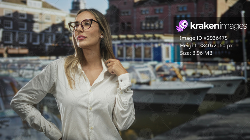 Woman touching hair near moored boats in front of brick building, wearing glasses and white shirt; contemplation.