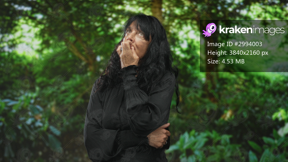 Woman touching hand to mouth while wearing a black dress and pendant necklace, posed in a studio set; quiet contemplation.