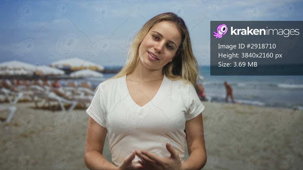 Woman touching hands on chest on beach studio set with white tshirt, umbrella and sunbed visible; calm relaxation.