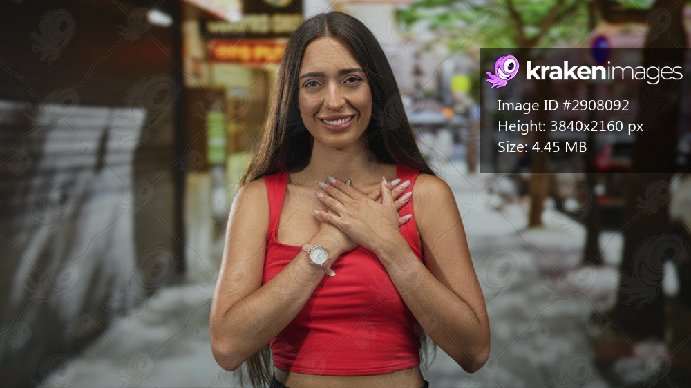 Woman touching hands to chest in red crop top on a busy urban street with trees and storefronts; gratitude.