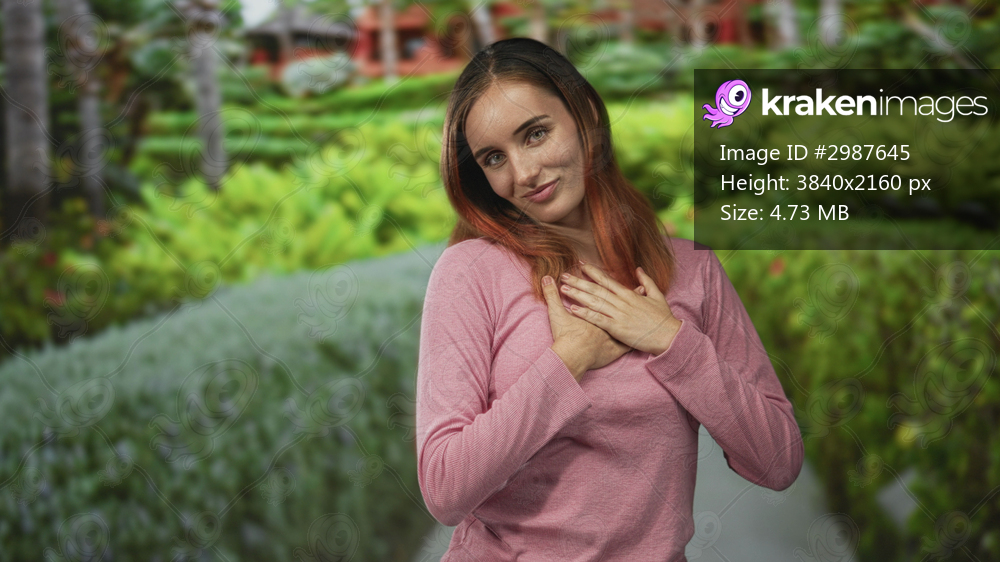 Woman touching hands to chest on a forest path, wearing pink sweater and smiling with eyes partly closed; gratitude calm.