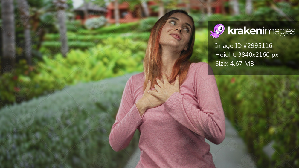 Woman touching hands to chest on a forest path, wearing pink sweater and smiling with eyes partly closed; gratitude calm.