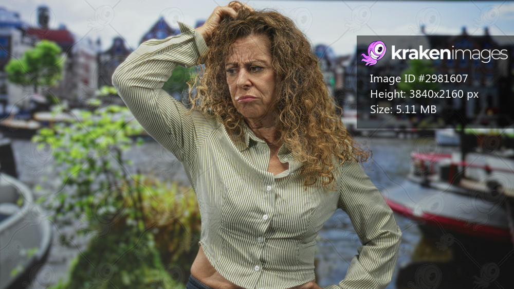 Woman touching head with hand in striped shirt on street by canal and boat, looking tense and pensive; frustration contemplation.