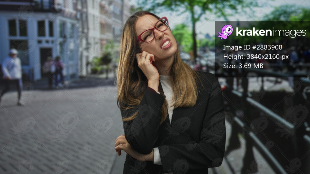 Woman touching her ear for earache on a busy city street by a canal, hand to jaw and grimacing; discomfort.