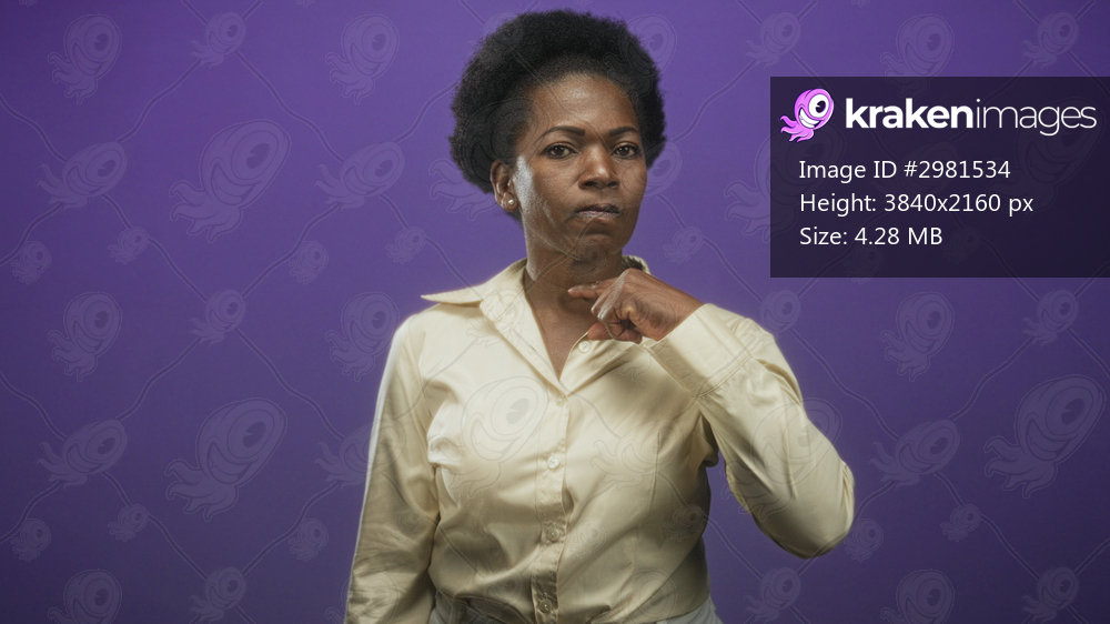 Woman touching her face with two fingers and later pointing to her chest in studio purple backdrop; contemplation thought pondering.