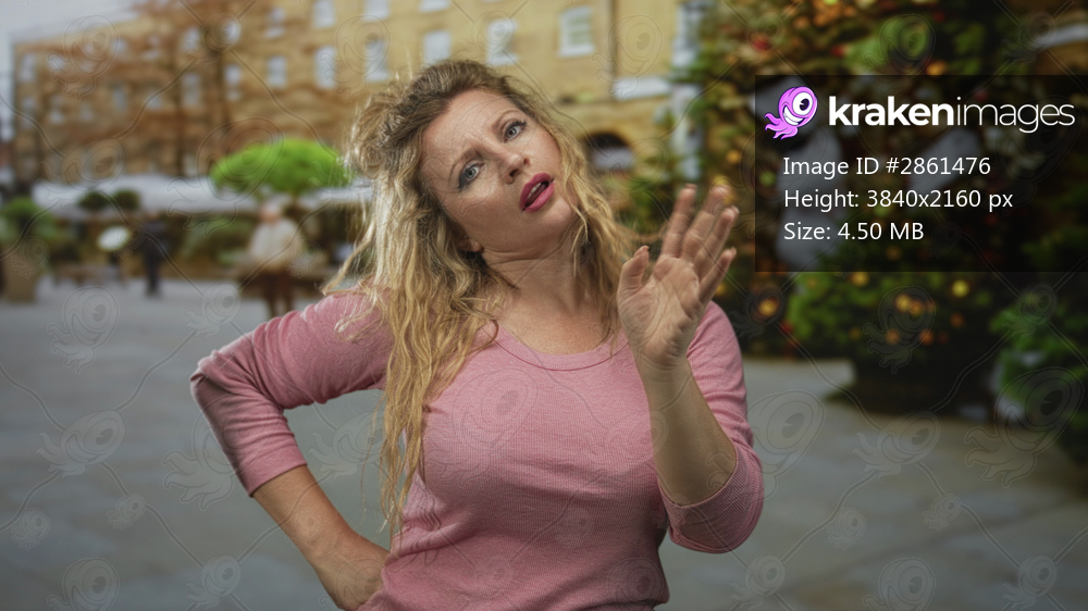 Woman touching her hair with hand on hip in street near holiday market and decorated trees; annoyance impatience.