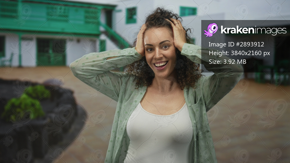 Woman touching her hair with hands to head, smiling widely in a white tank top showing chest in building courtyard; surprise joy.