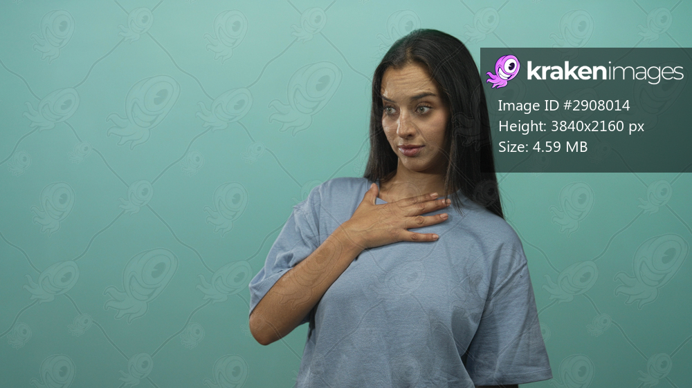 Woman touching her hand to chest, visible face and hand against a mint green studio wall; surprise vulnerability.