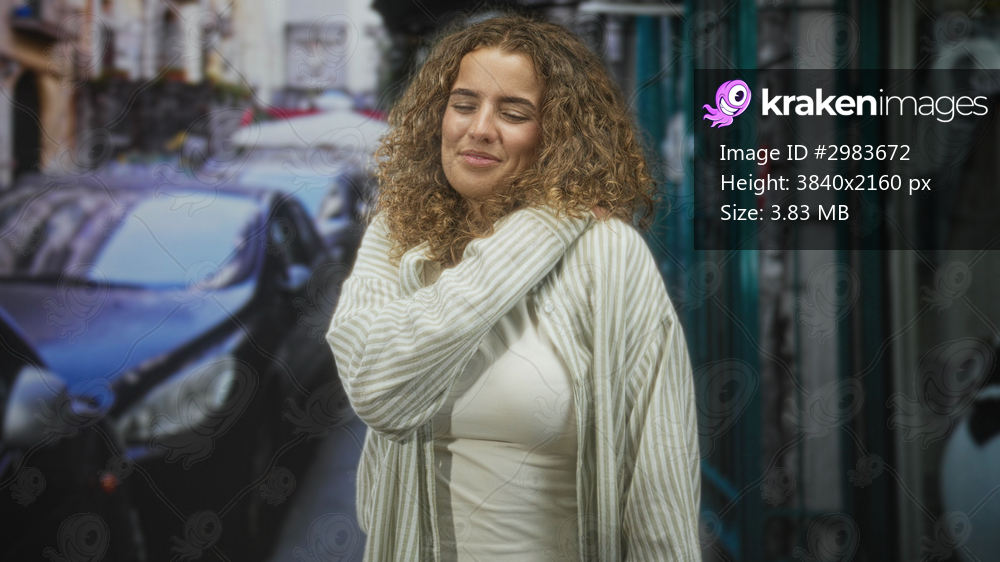 Woman touching her shoulder with hand on a busy city street among parked cars, looking up and smiling; serenity reflection.