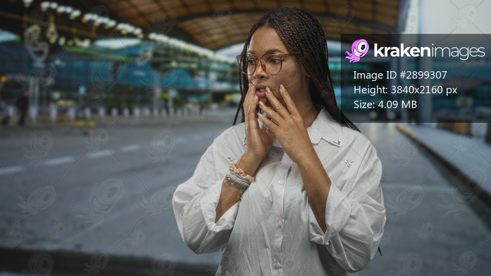 Woman touching lips with fingers at airport terminal wearing glasses and white shirt, hands near mouth in a pensive pose; contemplation.