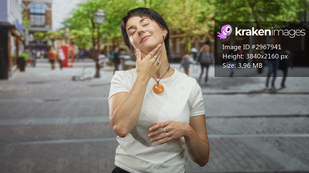 Woman touching neck with hand and rings, eyes closed, wearing white t shirt and orange pendant on a street; contentment calm.