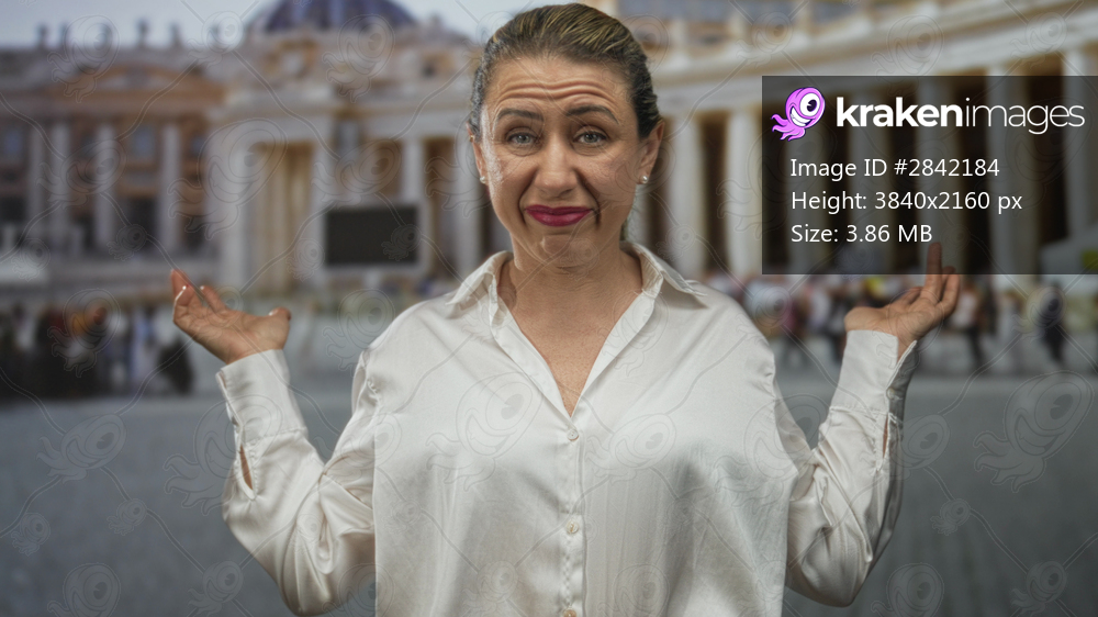Woman touching neck in vatican square before saint peters basilica under bright sunlight; concern fatigue resilience.