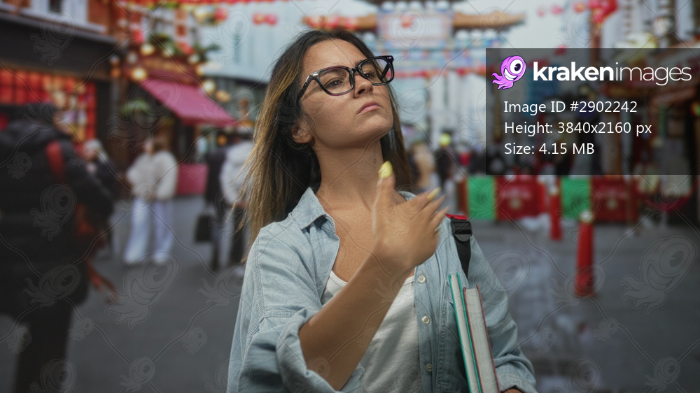 Woman touching neck while holding books and backpack on a crowded street with shops and lanterns visible; urban confidence.