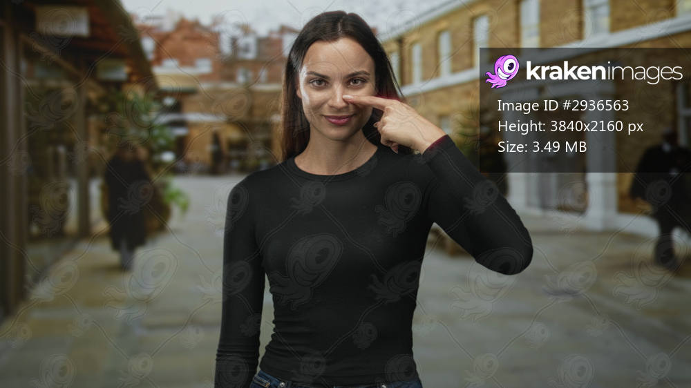 Woman touching nose with finger and smiling in front of brick building on a pedestrian street wearing black top and jeans; playful mischief.