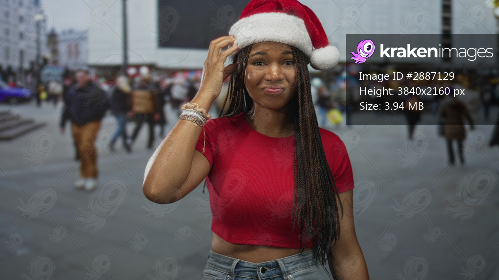 Woman touching santa hat on busy street, hand to head, red crop shirt with exposed midriff and bracelets; holiday playful.
