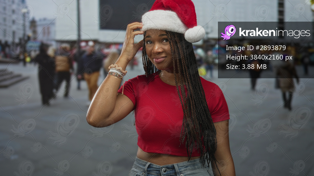 Woman touching santa hat on busy street, hand to head, red crop shirt with exposed midriff and bracelets; holiday playful.
