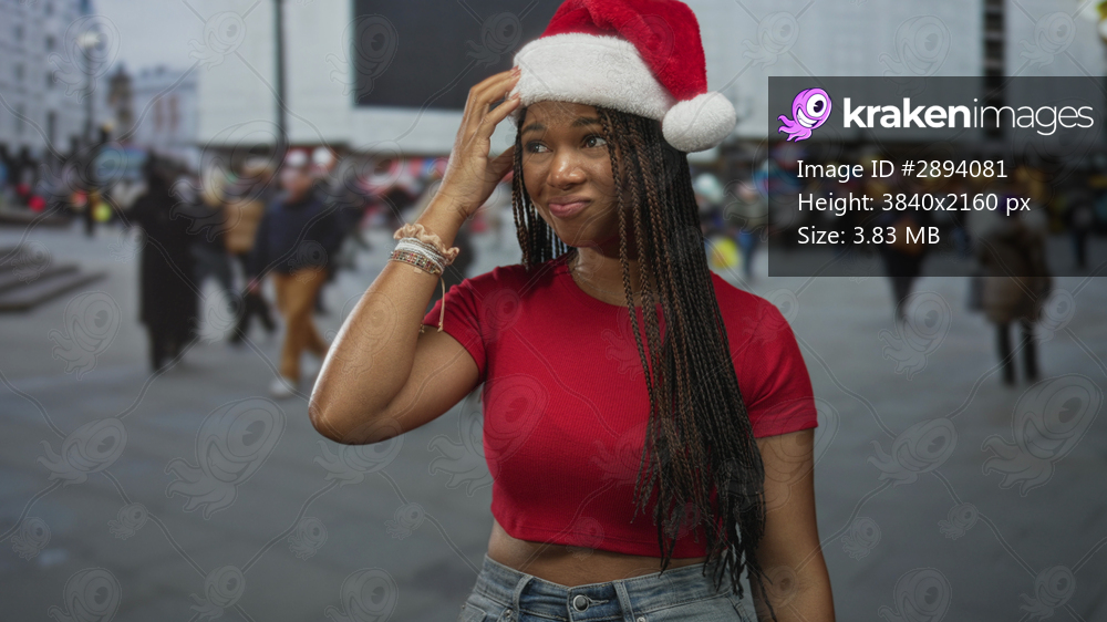 Woman touching santa hat on busy street, hand to head, red crop shirt with exposed midriff and bracelets; holiday playful.
