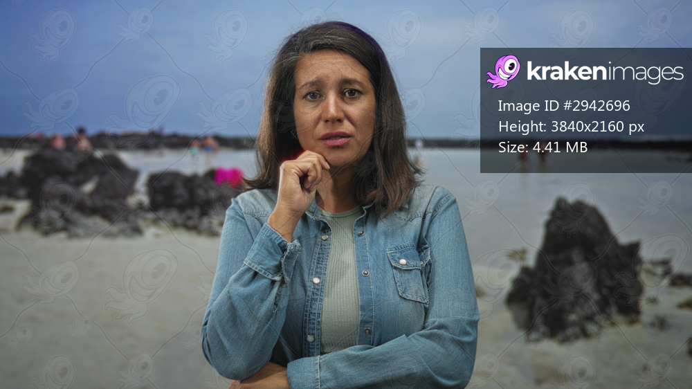Woman touching temple with finger, other arm crossed and worried expression against studio beach backdrop; concern reflection.
