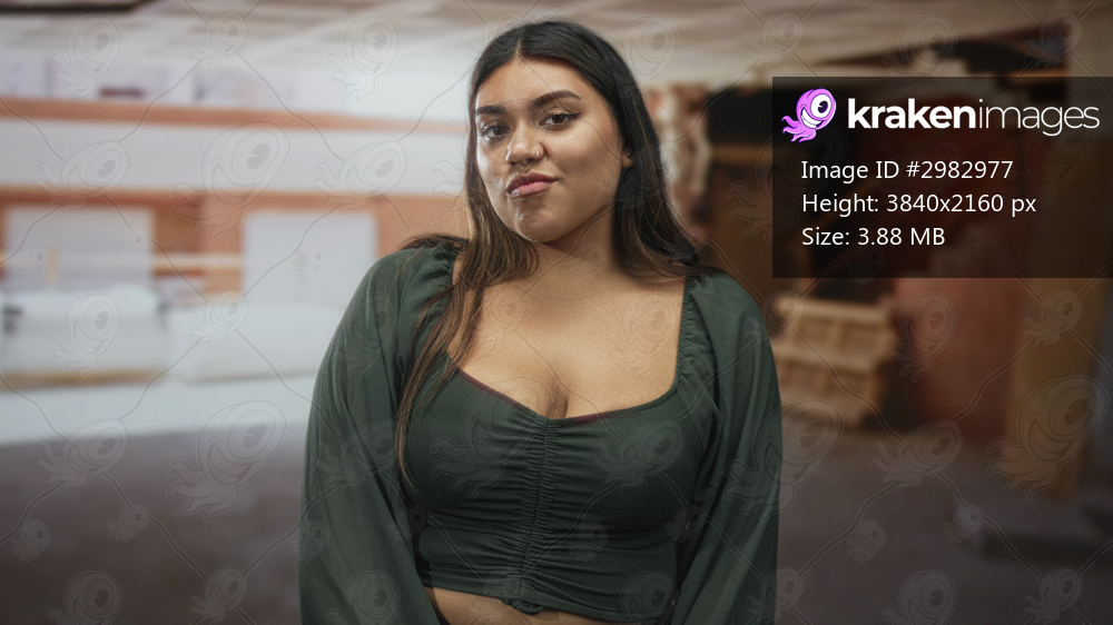 Woman touching temple with hand, visible cleavage and green ruched top in studio with brick staircase and pallets; quiet confidence.