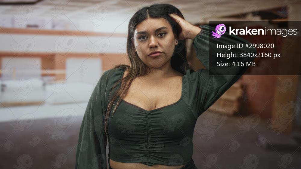 Woman touching temple with hand, visible cleavage and green ruched top in studio with brick staircase and pallets; quiet confidence.