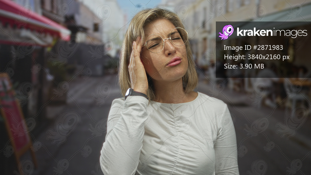 Woman touching temple and wearing glasses and smartwatch on sunlit urban street building facade; frustration.