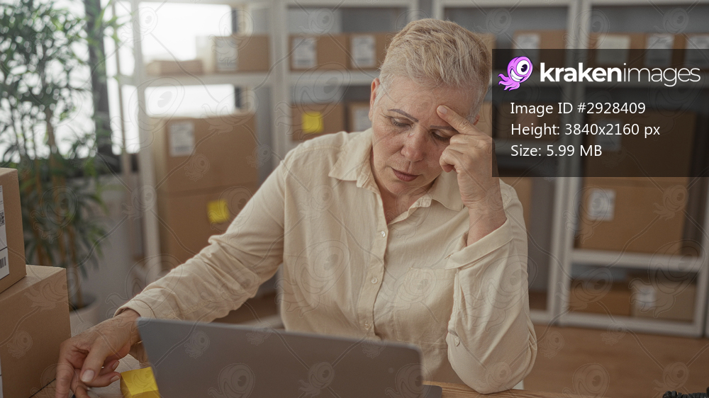 Woman touching temple while holding glasses at laptop among cardboard parcels on shelves in building; small business stress.