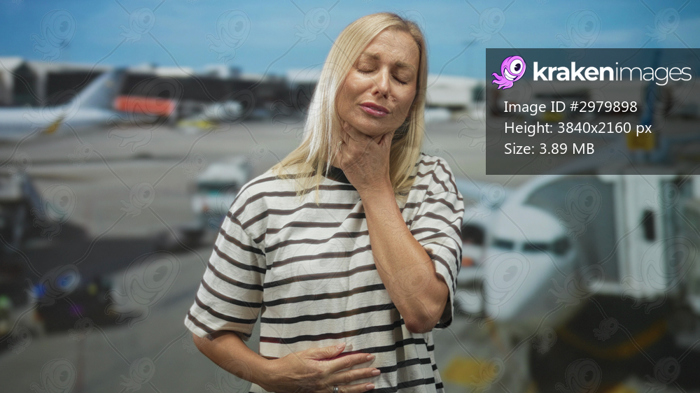 Woman touching throat with both hands and closed eyes at airport gate in striped shirt showing wedding ring; discomfort travel.