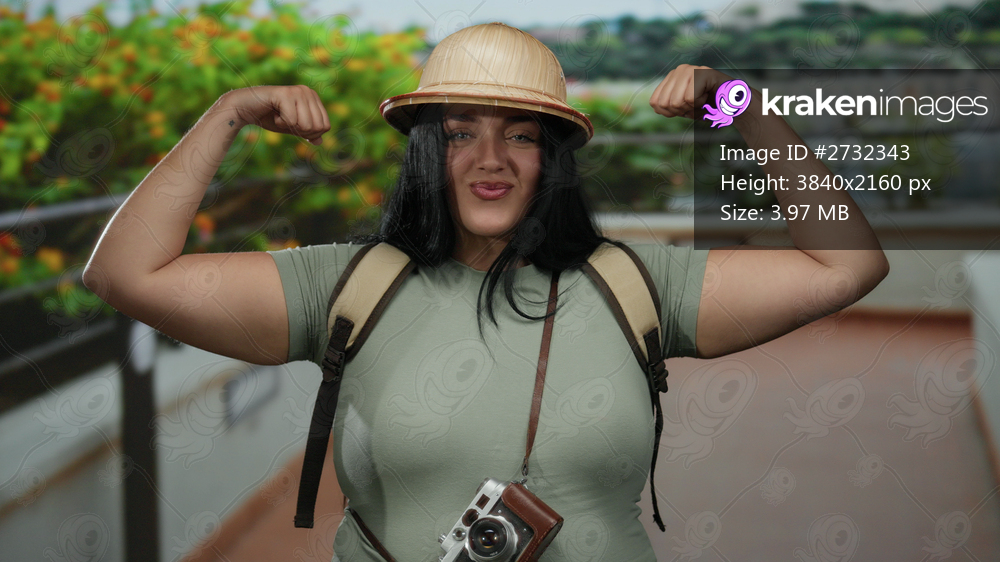 Woman tourist flexing in outdoor city street wearing hat with backpack and camera, expressing confidence and strength with a joyful expression.