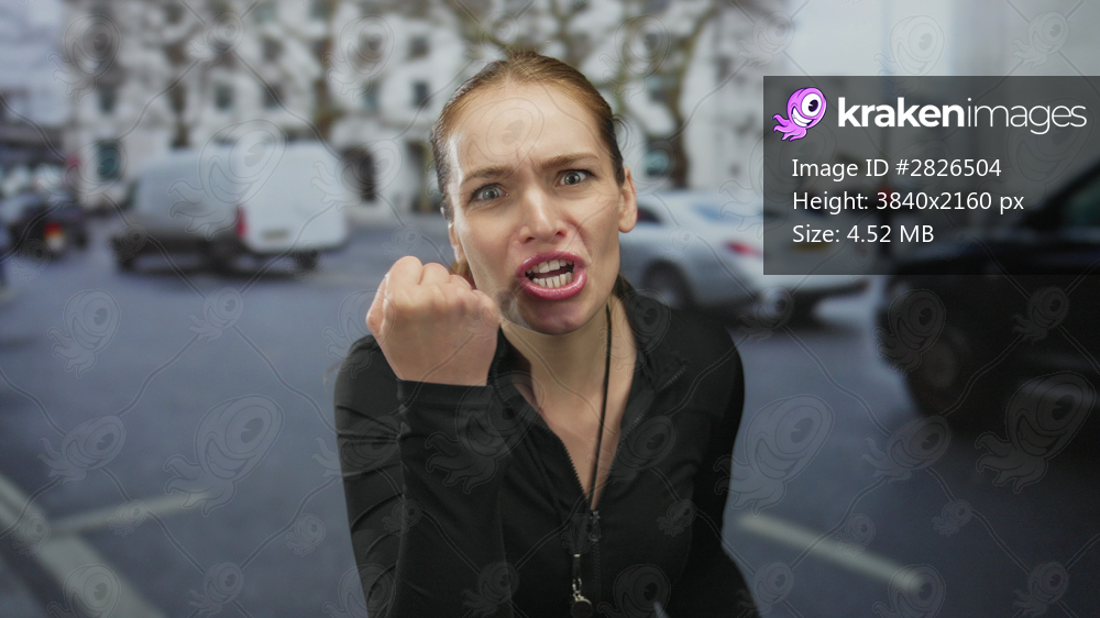 Woman trainer points finger in city street next to cars wearing black jacket and whistle; determination.