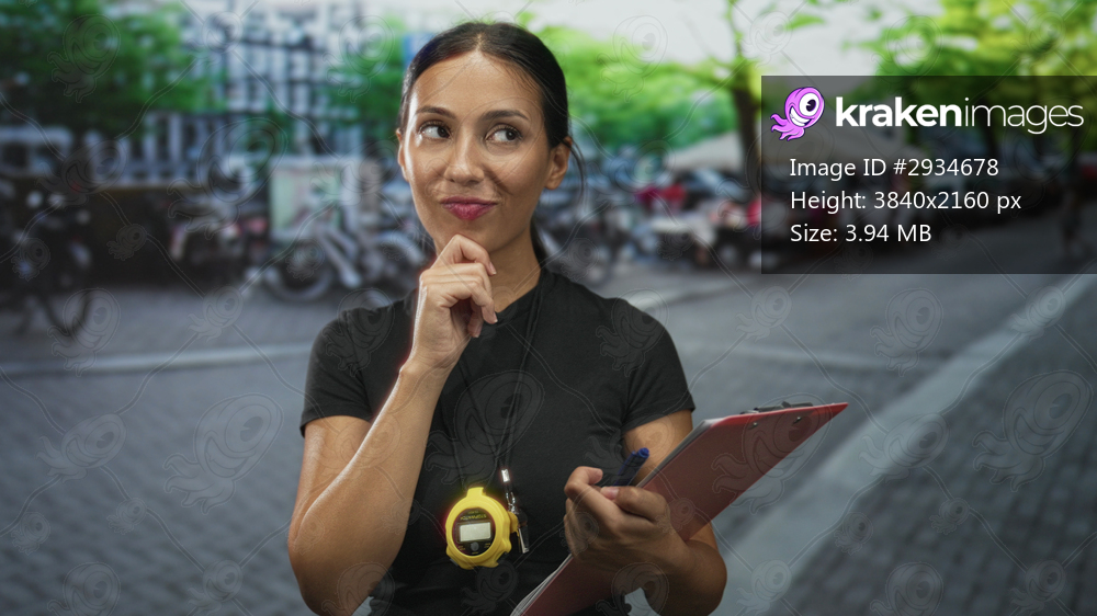 Woman trainer wearing black shirt with stopwatch whistle and keys on lanyard, holding clipboard on city street, hand on chin; doubt pondering.