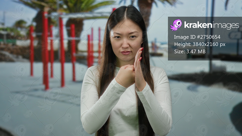 Woman training outdoors in gym setting with palm trees in background showing determination and focus while clenching fist in workout environment.
