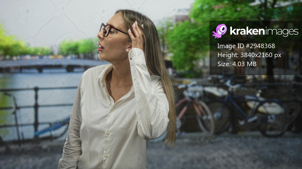 Woman tucks hair behind ear while adjusting glasses on canal street in amsterdam, near bikes and water; calm reflection.