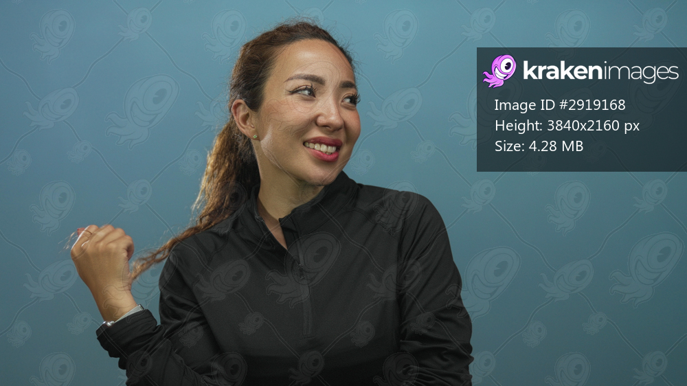 Woman twirling a strand of hair with hand while smiling and looking up in studio with teal backdrop; playful confidence.