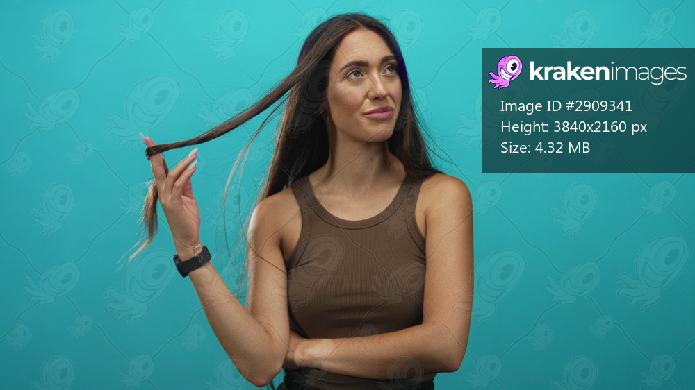 Woman twirling hair with fingers, crossed arms and bare shoulders in turquoise studio; thoughtful contemplation.