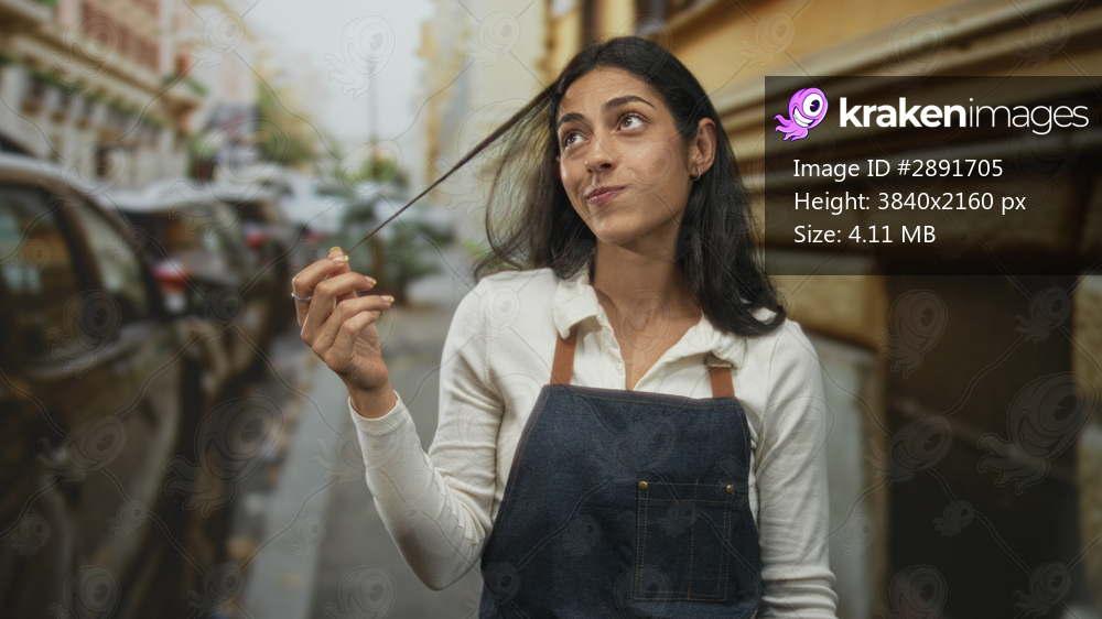 Woman twirls a strand of hair on a city street wearing denim apron and white shirt, glancing upward; contentment daydream.