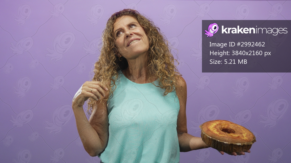 Woman twirls hair with one hand while holding a sponge cake in the other hand in a studio; joy comfort warmth.