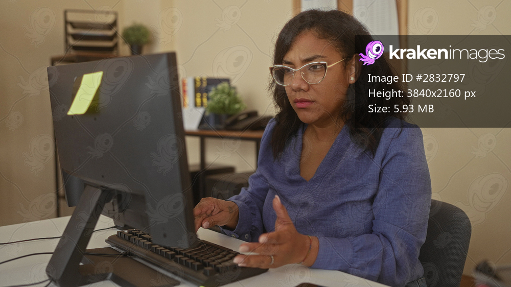 Woman types on computer keyboard in office building at desk with a yellow sticky note on the monitor; challenge frustration.