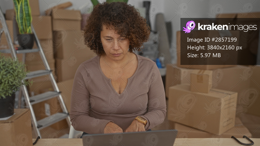 Woman types on laptop at wooden table surrounded by cardboard boxes and ladder in building; determination.