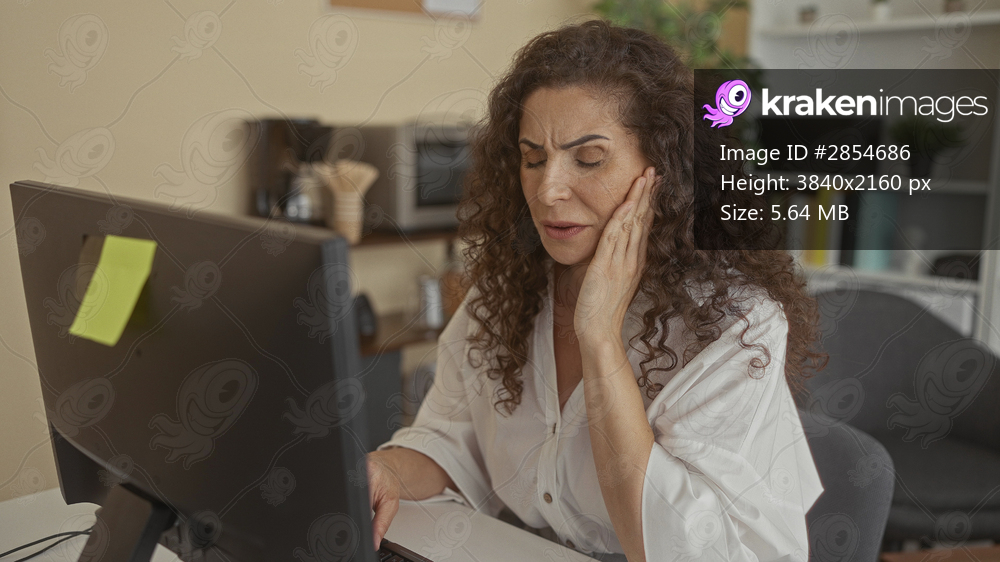 Woman typing at computer monitor with hand on cheek for toothache and concentrating at office desk in building; stress productivity focus performance.