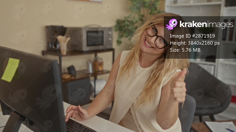 Woman typing with hand on keyboard at building desk, wearing glasses and smiling; cheerful productivity.