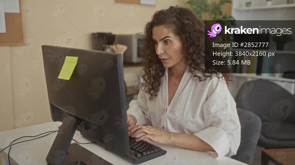Woman typing on keyboard at office desk with monitor and papers spread around; productivity concentration.