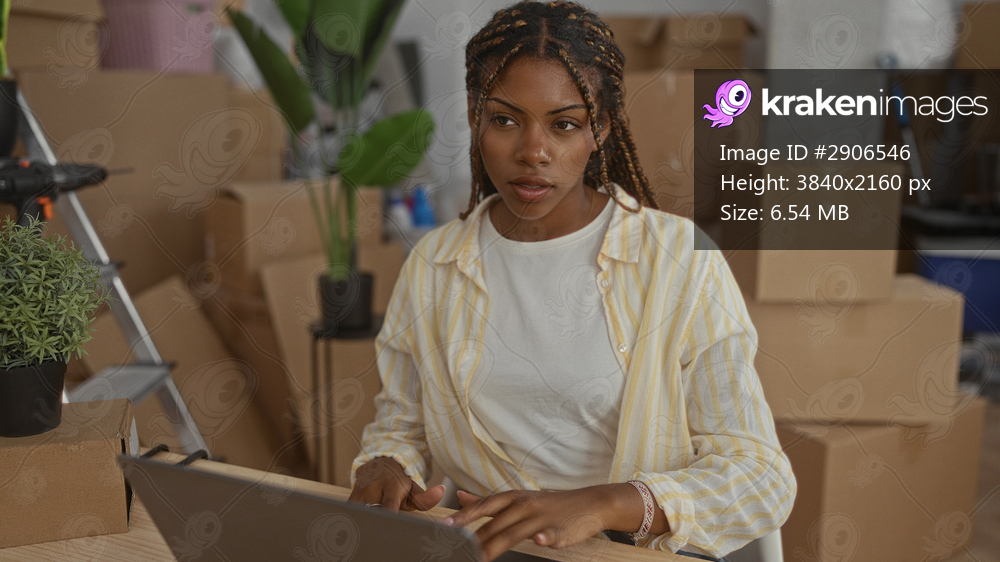 Woman typing on laptop at a table amid packed moving boxes in building, points finger as she looks to the side; quiet determination.