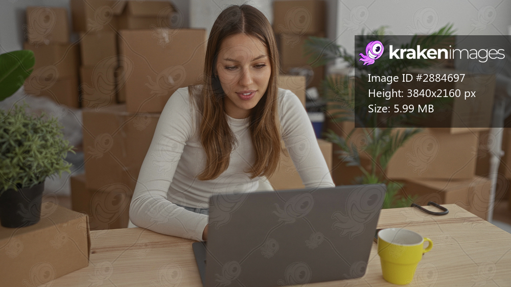 Woman typing on laptop at a table surrounded by packed moving boxes in building; moving day focused.