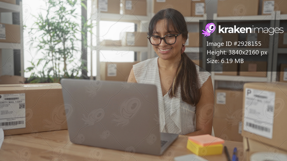 Woman typing on laptop at desk surrounded by stacked delivery boxes and shelving in office fulfillment area; online store productivity.