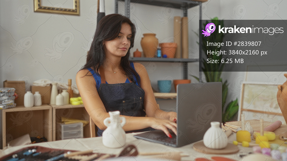 Woman typing on laptop with hand on chin surrounded by clay pottery and tools in studio; concentration.