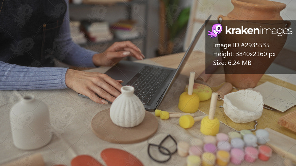 Woman typing on laptop with hands on keyboard at cluttered artisan studio table surrounded by pottery tools, small vases, sponge mallets and paint pots; creative concentration. - Kraken Images