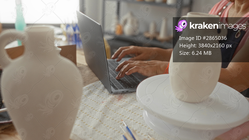 Woman typing on laptop with hands on keyboard beside ceramic vase in sunlit studio; creativity craftsmanship concentration productivity.