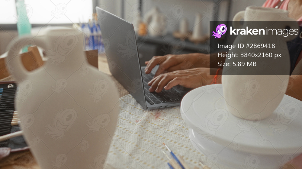 Woman typing on laptop with hands on keyboard beside ceramic vase in sunlit studio; creativity craftsmanship concentration productivity.